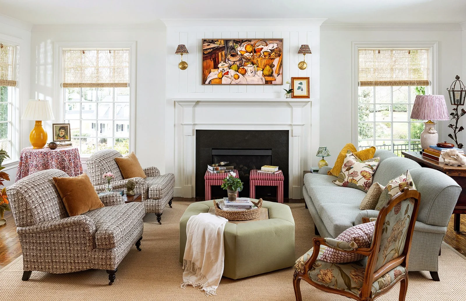 Adding a fireplace and hearth gives a clear focal point and sense of permanence to the room. Researching of historic New England homes informed the proportions and detailing of new millwork, grounding the room in precedent.