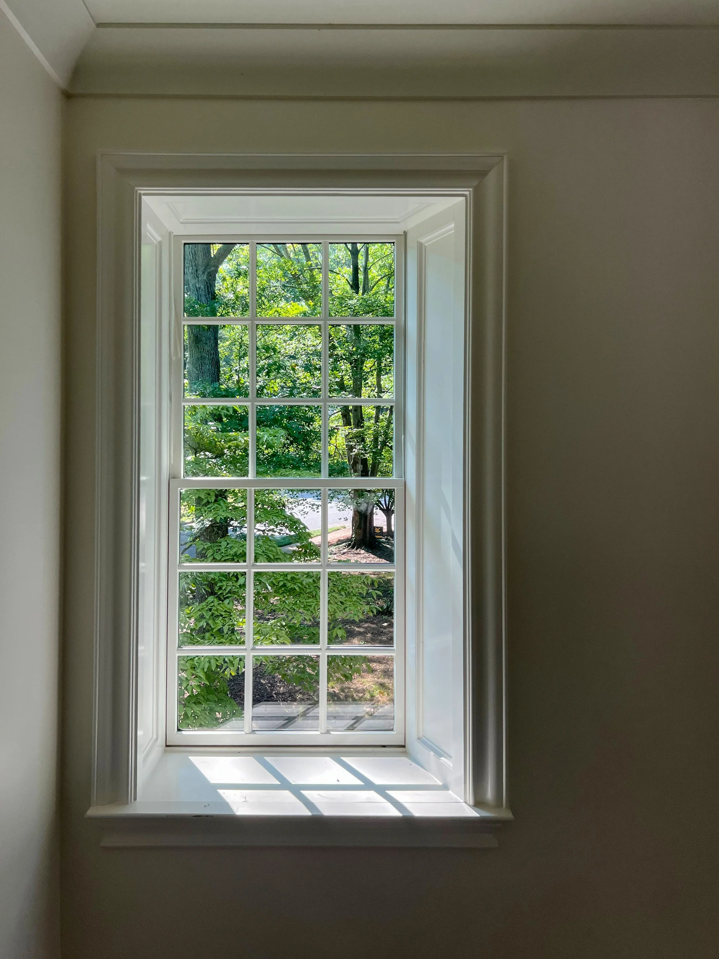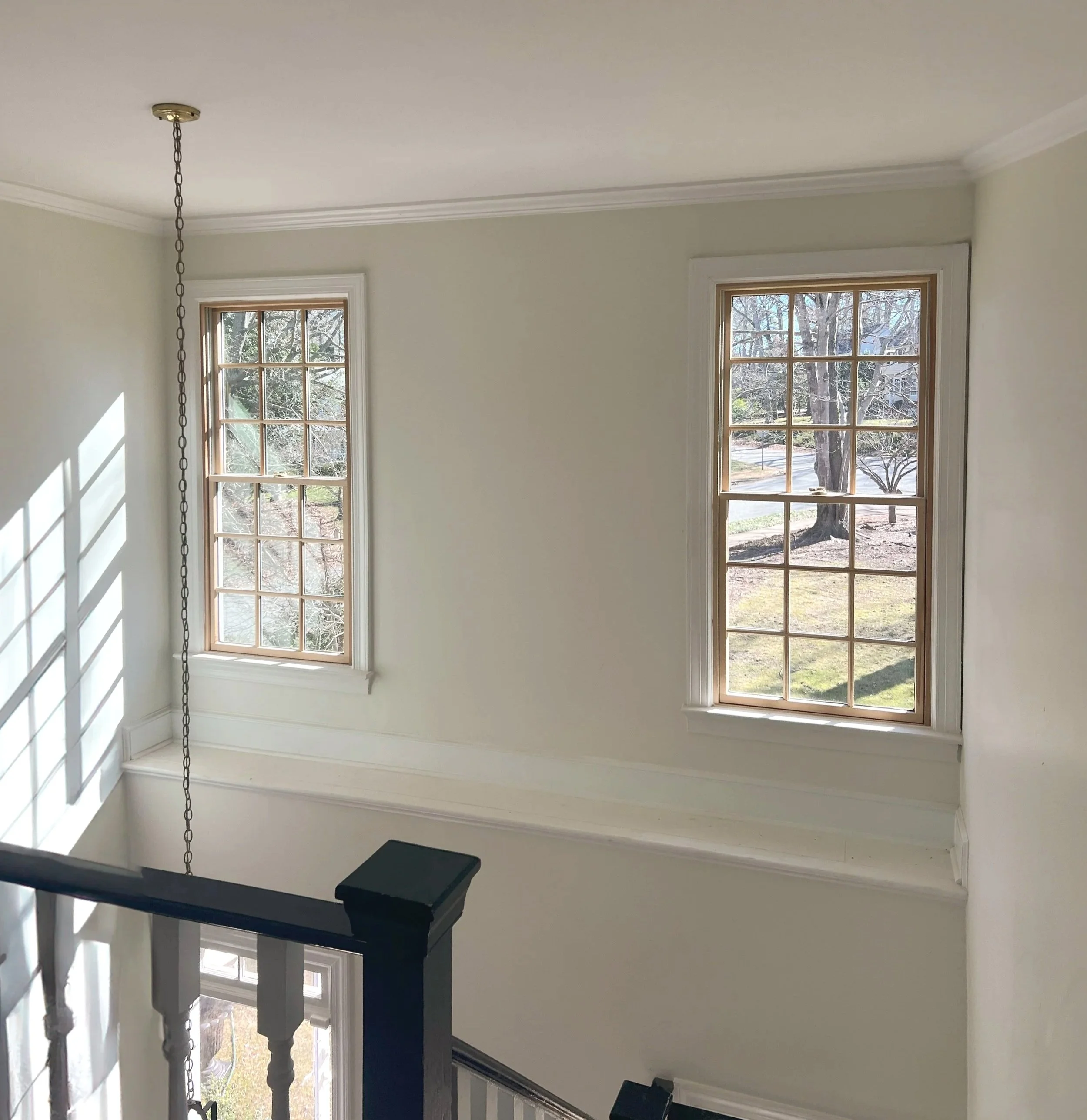 The dreaded “plant shelf” was removed by furring out the foyer wall. This simple move echoes the thick walls found in historic homes. Following Classical principles, flaring the walls around the windows outwards allows more light into the space, turning the outdated shelf into a stunning architectural moment.